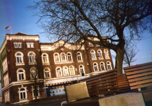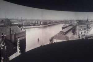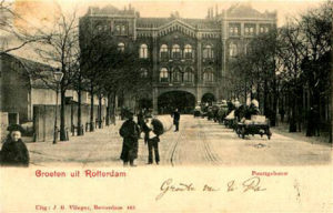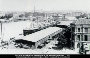 The orginal design of the architect J.C. van der Wall was for a monumental entrance to the Binnenhaven consisting of not one but two mirrored Poortgebouws reflecting the grandeur of the RHV. The 4-storey “gate-buildings” would act as wind-blockers (windschermen) for the ships passing through this narrow passage. Inspired by the London Bridge, the Poortgebouws were also intended to mask the fact that the bridge sat at an awkward angle with the Stieltjesstraat. Following the Pincoffs-Affair, it was decided not to make the second Poortgebouw although a smaller Poortgebouw would be made several years later in its place. This little brother was demolished in 1937 when the bridge, once the largest “basculebrug” in the world, was replaced.
