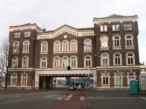 The street which passes under the Poortgebouw owes its name to the engineer Stieltjes. The most curious feature of the building, and often overseen, is its asymetrical Stieltjesstraat facades with one tower being two window bays wide and the other of three bays. Built in Neo-Romanesque style where symmetry was favoured, this asymetry is perhaps due to the fact that the envisioned pair of Poortgebouws should have first and foremost been viewed from the Koningshaven by the ships entering the harbour.